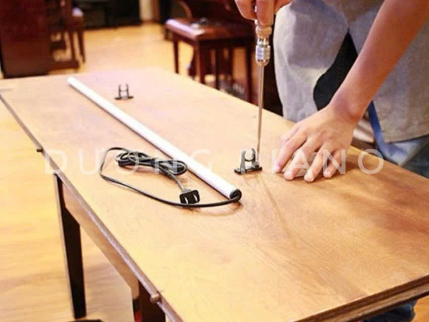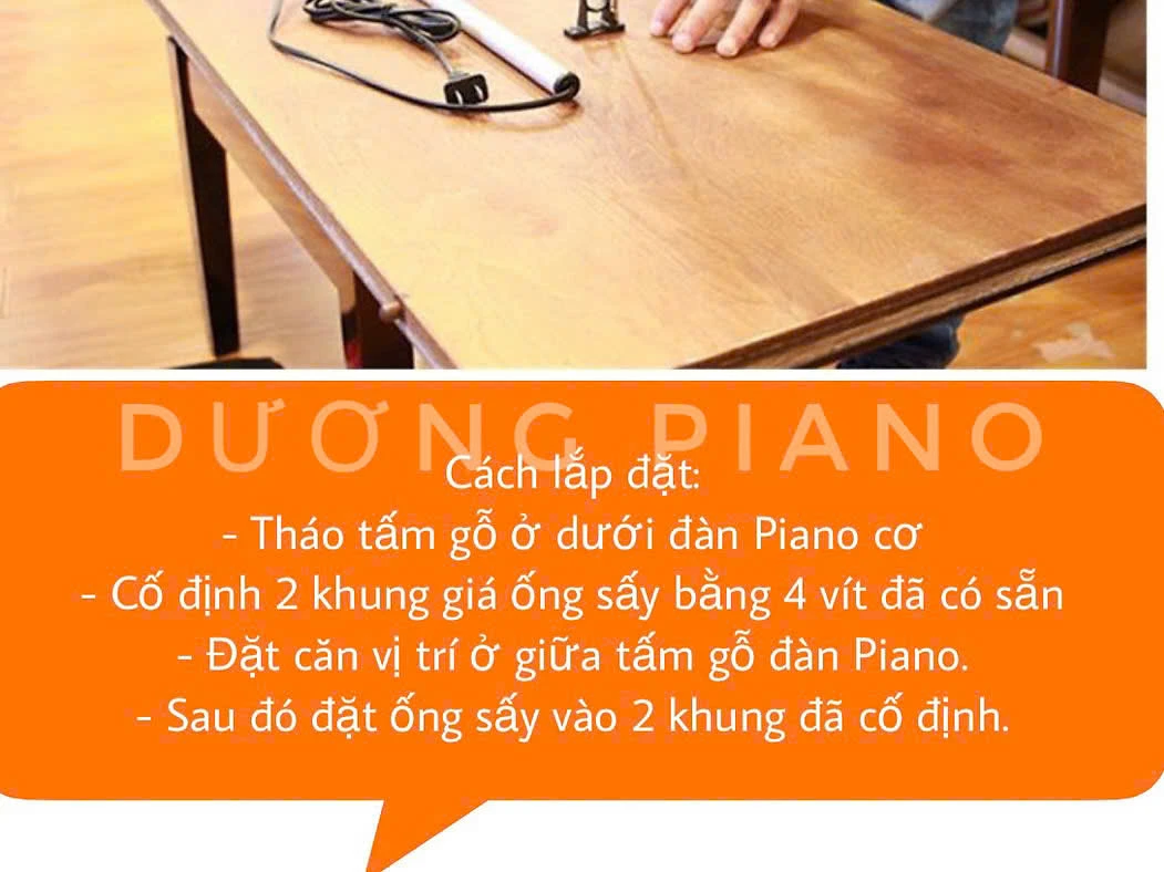 Ống sấy piano thường được lắp đặt ở đáy đàn, bên trong thùng đàn dưới. Điều quan trọng nhất là phải đảm bảo ống sấy không chạm trực tiếp vào bất kỳ bộ phận gỗ hay nỉ nào để tránh gây khô nóng cục bộ, có thể làm hỏng đàn.